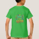 A design da camiseta apresenta o texto "Ato, Salvar a Terra" em letras grandes e coloridas. As letras estão estilizadas com um aspecto texturizado, quase desenhado à mão, e as cores são vibrantes e atraentes para os olhos. O fundo do design é azul escuro, o que ajuda a fazer o texto pop. Há também algumas pequenas ilustrações coloridas de folhas e flores espalhadas ao redor do texto. De um modo geral, o design é ousado, colorido e atraente, e transmite efetivamente a mensagem da proteção ambiental.