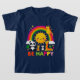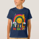 Um design com um balão colorido de ar quente "Be Happy" flutuando sobre colinas rolantes, animais, arco-íris e florestas. Perfeito para pequenos exploradores!