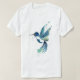 pintura aquarela tradicional de um beija-flor azul espalhando suas asas e voando em uma t-shirt