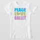 Balé do amor da paz… que outros você precisam na vida? Presente perfeito para algum viciado da dança. Não importa se você é treinado no balé, você aspira ser uma bailarina de prima, seu quarto inteiro é cheio da decoração da bailarina, seu tenha mais tutus e calçados de dedo do pé do que você precisará nunca, você um sonho de um dia que se transforma um dançarino profissional em uma mostra em Broadway, você é parte de uma equipe competitiva da dança, você é um professor do balé ou você é um estudante do balé… que você é viciado dançar! Ideia engraçada do presente para algum dançarino de balé. Excelente para alguma diva do balé. Características de design um coração e um sinal de paz. Veja nossa loja para mais divertimento e paz original amar… camisas e presentes.