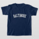 Verifique para fora este t-shirt de Baltimore! É você de Baltimore, Maryland? Você tem um amigo ou um membro da família que amem Baltimore, Maryland? Em caso afirmativo, este t-shirt da "bandeira" é exatamente o presente que você está procurando! As características de design "Baltimore" na rotulação branca arqueada na pia batismal clássica da faculdade.