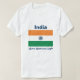 Um título e um slogan editáveis acompanham o motivo circular azul em uma banda branca com uma banda alaranjada acima e banda do verde abaixo da bandeira indiana na parte dianteira deste t-shirt. A parte traseira indica um mapa detalhado de India.