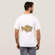 Um título e um slogan editáveis acompanham os motivos amarelos em um fundo azul da bandeira de Kazakhstani na parte dianteira deste t-shirt. A parte traseira indica um mapa detalhado de Kazakhstan.