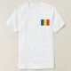 A parte dianteira deste t-shirt carrega uma bandeira romena pequena com suas bandas verticais familiares do azul, as amarelas e as vermelhas, quando a parte traseira indicar um mapa de alivio de Romania. Disponível em t-shirt, em camisolas, em polo, em longo-Capas e em mais.