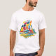 Um veleiro colorido com uma manta de retalhos de padrões geométricos vibrantes desliza através de ondas estilizadas e giratórias. A composição apresenta tons negros de vermelho, azul, amarelo e laranja, adicionando um toque dinâmico e animado à cena.