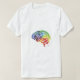 Camiseta de tendência em preto (ou branco), apresentando no centro uma ilustração geométrica detalhada de um cérebro humano, dividida em duas metades. O lado esquerdo é desenhado com linhas estruturadas e tons legal como cinzas e azuis, simbolizando a lógica e a análise, enquanto o lado direito se rompe com cores vibrantes como vermelho, amarelo, rosa e verde em forma de cinzas e traçados artísticos, simbolizando a criatividade e a imaginação. A design combina pensamento e emoção, refletindo uma personalidade que ama tanto arte quanto conhecimento.