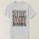 Esta camiseta clássica e confortável é uma obrigação para qualquer guarda-roupa. É feito de algodão macio e durável e apresenta um design eterno que nunca sairá do estilo. O ousado gráfico "Stop Talking, Start Doing" na frente é um poderoso lembrete para tomar medidas e fazer as coisas acontecerem.