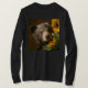 A cute bear cub curiously peeks from behind a cluster of vibrant sunflowers. The warm colors and soft lighting create a cozy atmosphere.