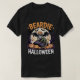 Dragão barbudo com asas de morcegos tocados sobre uma rocha, cercados por lanternas, árvores sem folhas e morcegos voadores em frente a uma lua de cheio. Um design de Halloween divertido e assustador.