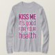 Declare as suas necessidades com uma dose de charme na nossa "Beije-me que é bom para a sua saúde". A mensagem ousada, mas simples, é reproduzida em uma fonte rosa, limpa e atraente que adiciona um toque de doçura e confiança ao seu estilo. É a camisa perfeita para aqueles que acreditam que um beijo é o remédio mais doce e uma maneira simples e na moda de mostrar uma personalidade divertida.