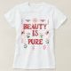 Uma design de camiseta graciosa com a frase "A beleza é pura" em tipografia elegante e fluente, destacada por elementos naturais macios como folhas, flores ou gotículas de água. O design abraça a simplicidade e a sofisticação, simbolizando a ideia de que a verdadeira beleza vem da autenticidade e da paz interior. Perfeito para aqueles que celebram a elegância natural e a positividade.