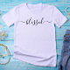 Uma escrita romântica em letras negras numa camiseta branca que diz: abençoada. Para cristãos. Mulheres de Deus. Bonito. Mantenha as pequenas caixas seguindo a palavra para que as letras decorativas fluam.