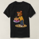 A cute cartoon bear in a yellow outfit holds a colorful birthday cake with candles, standing on a round rug and smiling happily.