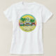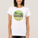 Trabalho de arte digital de Bondi Beach, Sydney Austrália. Descrição: design de camiseta em forma redonda com Paraíso de Praia Bondi com palmeiras e céu amarelo. Design exibido na T-Shirt feminina. Trabalho de arte por Ange Irwin - Sequin Dreams Studio