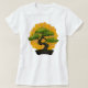 Uma bela ilustração de uma árvore bonsai que se senta num pote preto contra um fundo circular amarelo brilhante.