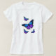 Bonito T-Shirt Azul Roxo e Borboletas Negras. Linda ilustração detalhada de borboletas azuis, roxas e pretas em uma t-shirt. presente de excelente para amantes de borboletas!