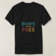 Este design de camiseta proclama corajosamente "Bravo e Livre" em um vibrante esquema multicolorido. É provável que as palavras estejam separadas, com cada uma usando uma cor diferente de chamar os olhos. É provável que a fonte seja negrito e nítida, permitindo que a mensagem seja lida facilmente. O sentimento geral é enérgico e inspirador, perfeito para alguém que abraça um espírito corajoso e independente. Muito impressionante e bela design.