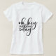 A noiva vai adorar esta camiseta quando se preparar para o seu grande dia. O texto diz Bride nas costas e "oh hey, Wedding Day" na frente