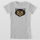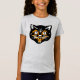 Esta camiseta tem um rosto preto de Halloween divertido, que sorri e tem olhos brilhantes e sotaques laranja e branco.