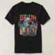 Uma design de camiseta divertida e elegante com um esqueleto legal dando um sinal de paz enquanto vestia óculos de sol e uma mochila. A design é colocada contra um pano de fundo vibrante na praia, com palmeiras, e o texto "Bruh" é apresentado em letras grandes, negrito e coloridas no topo, com "We Out" escrito no fundo.