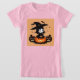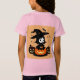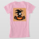Ótima ilustração de uma bruxa jovem com cabelo laranja rodeado de jack-o-lanternas. A atmosfera mágica é destacada por morcegos voando sob uma lua laranja cheio, criando um humor lúdico de Halloween.