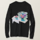 Flores vibrantes em tons de rosa, roxo, laranja e azul são representadas em estilo de desenho solto, com um grande buquê em um vaso azul e um pote menor em uma mesa claramente marcada. As braçadas são expressivas e coloridas, transmitindo um senso de vida e espontaneidade artística.