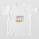 O texto fica limpo na frente da camisa, talvez numa cor brilhante e amigável.O texto fica sozinho, talvez numa letra lúdica com um coração de solteiro colocado estrategicamente perto das palavrasO tom geral pode ser charmoso, lúdico ou legal dependendo da fonte, cores e estilo de ilustração escolhidos