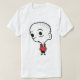 Ímpar menino de desenho animado com uma cabeça incrivelmente grande, olhos pretos e cabelo picante esportando uma camisa vermelha e shorts pretos. Arte digital original de Taylor Addams.