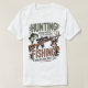 Esta camiseta branca apresenta um design que celebra perseguições ao ar livre. O texto "CAÇA SOLVADA A MAIOR PARTE DO PROBLEMA" está no topo, com uma ilustração de um rifle e um veado. Abaixo, "FISHING SOLVES THE REST" é exibido acima de um peixe-base saltando, sugerindo amor tanto pela caça quanto pela pesca.