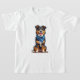 Cachorro alegre sentado em pé, mostrando uma expressão amigável com a língua para fora. Tem um casaco predominantemente preto com marcas brancas e laranja distintas na face, no peito e nas pernas. O cachorro está vestindo uma bandana xadrez azul ao redor do pescoço, o que adiciona um toque de na moda. O fundo é branco claro, enfatizando as cores vibrantes do cão e o comportamento alegre.