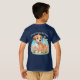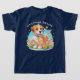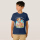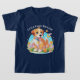 Uma t-shirt com uma fotografia de um filhote fofo sentado entre as flores. Ele parece muito feliz por estar cercado por flores e borboletas. O presente perfeito para dar àqueles que amam cachorros. O slogan é "Pequenas patas, Grande Amor". Contém conteúdo generativo.