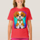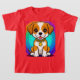 Um cachorrinho de desenho animado fofo com uma coleira dourada, sentado contra um fundo radial colorido e brilhante, exala charme e felicidade.