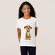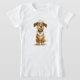 Cachorro estilo desenho animado com uma expressão alegre. O cão tem um casaco marrom claro com pelos brancos no peito e alguns tufos na cabeça. Suas orelhas são caídas e tem olhos grandes e expressivos. Usa uma coleira marrom com uma plaquinha e senta-se com as patas dianteiras ligeiramente afastadas, dando um comportamento convidativo e amigável. O fundo é branco simples, tornando o cão o foco principal da imagem. No geral, o personagem exala calor e simpatia.