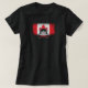 Uma bandeira canadense rasteira atrás de um caminhão que ostenta uma folha de mapa e a palavra "liberdade" em letras vermelhas que correspondem às cores da bandeira canadense.