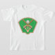 Este design é um campo de beisebol. A perspectiva é olhar para o campo. Você pode ver o diamante e depois o campo externo. Sobrepostos no topo estão dois morcegos de beisebol se cruzando e um beisebol. Este design de campo de beisebol parece excelente nesta t-shirt de raparigas. Perfeito para si mesmo ou como presente