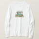 Uma camisa de t que caracteriza uma ilustração de uma casa retro do reboque com listra de turquesa e toldo e três flamingos plásticos cor-de-rosa na jarda. O texto customizável diz que "Home é onde você pôr seus flamingos!"