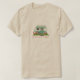 Uma camisa de t que caracteriza uma ilustração de uma casa retro do reboque com listra de turquesa e toldo e três flamingos plásticos cor-de-rosa na jarda. O texto customizável diz que "Home é onde você pôr seus flamingos!"