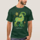 Tee em uma representação estilizada de uma cabra, intricadamente decorada com padrões de verde e amarelo, representando o signo zodíaco Capricórnio. Os elementos circundantes incluem símbolos celestes e designs de folhas.