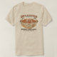 A carne de porco da marca e o t-shirt delicioso dos feijões, as senhoras retros legal do estilo do vintage ou o T dos homens de uma comida velha podem etiquetar. Carne de porco saboroso e feijões em uma bacia com bacon, com molho de tomate.