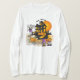 Um adorável casal gnomo está em frente à sua assustadora casa assombrada que tem jack o'lanterns por toda a parte. Um fantasma está pairando perto da árvore. Os morcegos estão voando perto da lua de cheio laranja do Halloween. Todos os designs estão disponíveis em tamanhos de criança para ajustado em adultos.