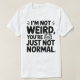 Gato que não sou estranho, você é apenas design normal. Para um amante engraçado de Cat estranho, a pessoa falava com os amigos sobre o gato fofo e ser estranho ou Nerd. Descrito por um gato engraçado e texto "Não sou estranho, você é normal".