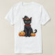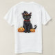 Gato preto, bonito, de olhos verdes, em um traje de bruxa com duas lanternas de Jack-o-Lanterna.