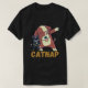 Um design de camiseta lúgubre com um gato relaxado esnozando de um lado com o texto "Catnap Lover" e um cachorro alegre se balançando ao sol do outro lado com o texto "Dogday Lover".