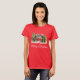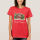 Camiseta com um tema de Natal bonito e caprichoso. Um trailer aconchegante decorado para o sorteio de Natal entre alguns pinheiros.
