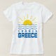 Desfrute o verão com esta camiseta feminina de verão branca com tema Chania, Grécia, sol e ondas do mar. Este design apresenta ondas de sol e água com Chania em fonte estilo grego com uma grande palavra azul Grécia. Use esta camiseta nas suas férias ou dê como um presente especial ou lembrança da Grécia.