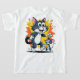 Design de camiseta divertida com um gato brincalhão perseguindo um rato com queijo. Cores brilhantes, fundo de explosão cômica e estilo de arte dinâmico o tornam perfeito para visto casual.