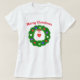 T-shirt with my digital design of a pretty Christmas wreath decorated with blue, green, red, white and purple hearts and a big red heart hanging from a red ribbon. Red text says "Merry Christmas".