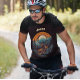 Ciclismo Vida, retrorreflecção em laranja e azul de um ciclista andando pelas montanhas e pela floresta com o sol ao fundo