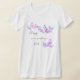 Camiseta Bonito e feminina com citação de positividade e borboletas delicadas. O design da borboleta aquarela é em tons de lilás rosa e roxo. O slogan positivo diz "Mudança não é algo para temer" e é escrito em uma elegante tipografia de estilo manuscrito.