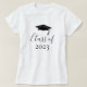 Camiseta branca moderna e simples, com legenda, classe 23, com uma torre superior para efeito adicionado.
